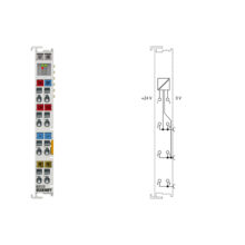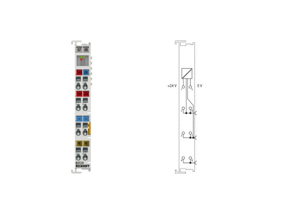 The KL9510 power supply terminal generates an output voltage of 10 V DC from the (24 V DC) input voltage, which can be accessed at the terminal. The following Bus Terminals are also supplied with this voltage via the power contacts. The power LEDs indicate the terminal’s operating state. The input voltage and the output voltage U0 are not electrically isolated.